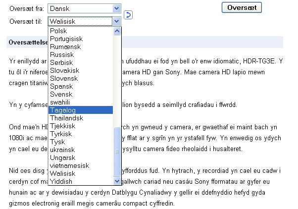 Oversætterfunktionen giver også mulighed for at oversætte på kryds og tværs mellem en lang række andre sprog som for eksempel afrikaans, albansk, bulgarsk, hollandsk, hindi parsi og polsk og selvfølgelig de nærliggende sprog (i hvert fald geografisk) engelsk, tysk og fransk.
