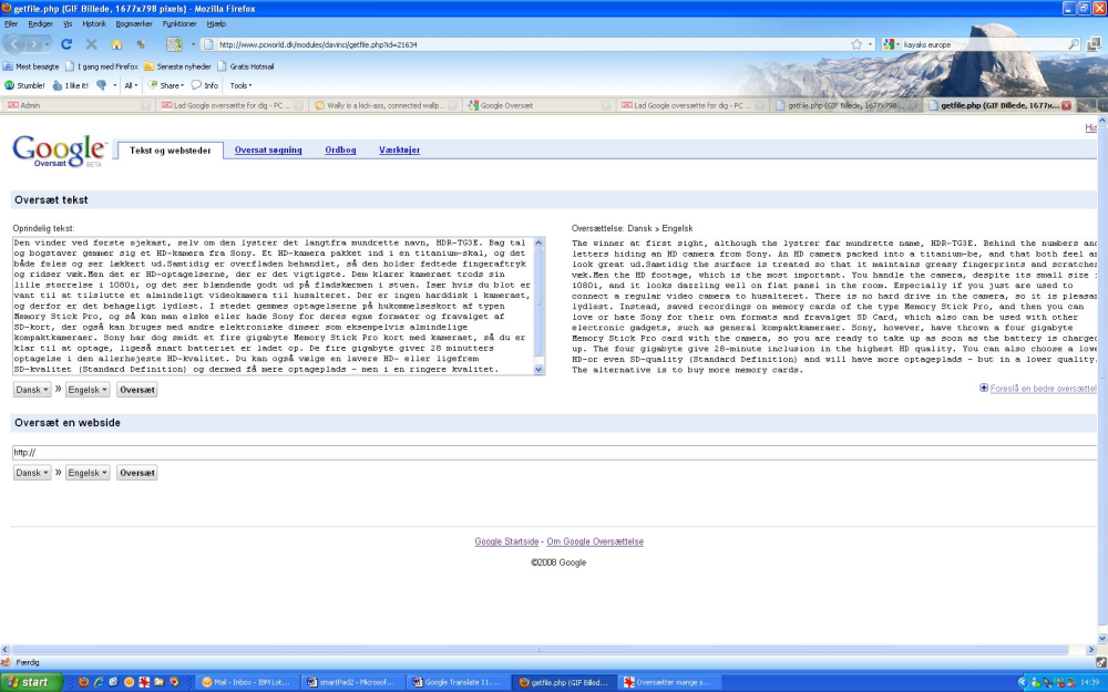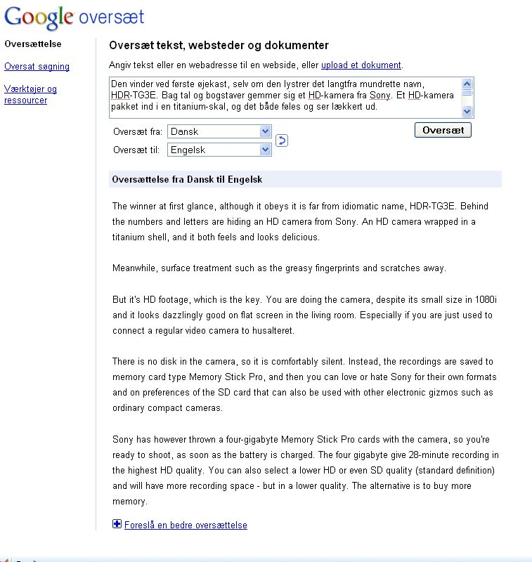 Man kan også indsætte et stykke tekst og så få det oversat. For halvandet år siden fik vi oversat en anmeldelse af et HD-kamera, så hvad er mere nærliggende end at bede den opgraderede Google translatør oversætte den samme tekst.