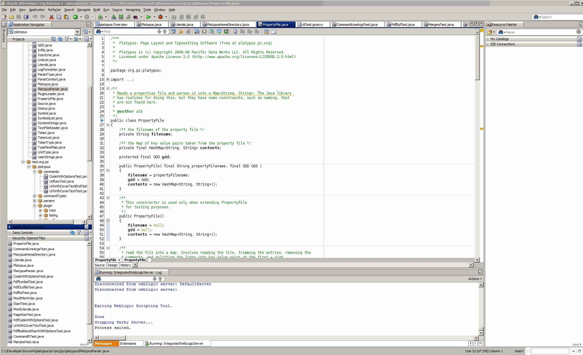 Editor i JDeveloper med et panel i bunden til håndtering af en instance af WebLogic server.