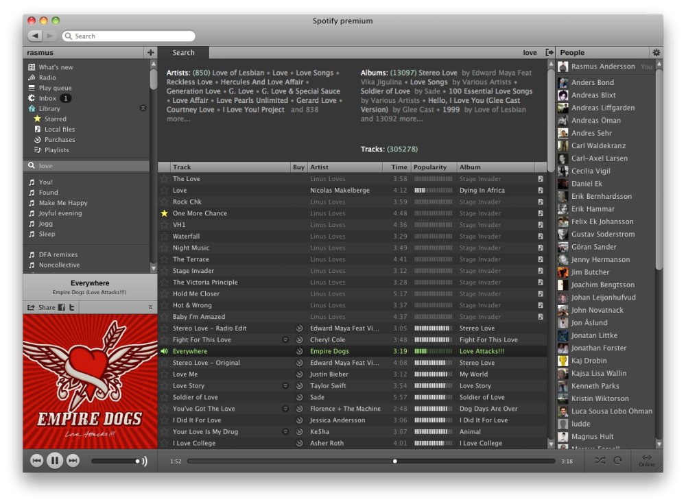 For at få adgang til de mange musiknumre kræver det, at du installerer Spotifys egen musikafspiller. Den minder i sin opbygning meget om Apple iTunes, hvor du i venstre side har dine afspilningslister og et søgefelt, der søger i hele Spotifys musikdatabase, som er imponerende stor.