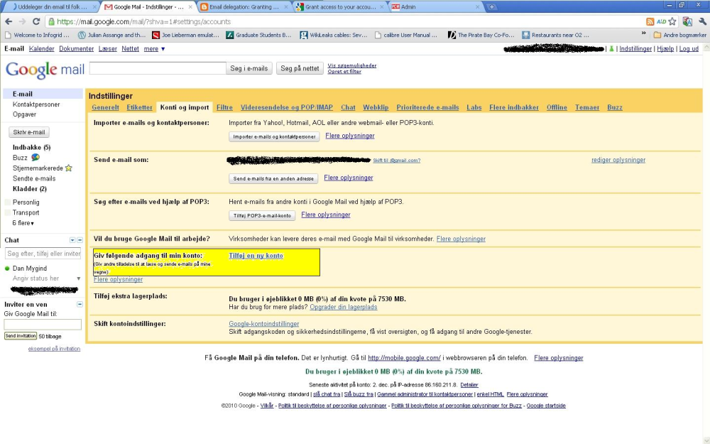 Vælg derefter fanebladet "Konti og Import". Her kan du give en anden Gmail-bruger adgang til at læse dine mails og sende mails i dit navn. Det sker ved at klikke på linket "tilføj en ny konto" og indtaste Gmail-brugerens mail.