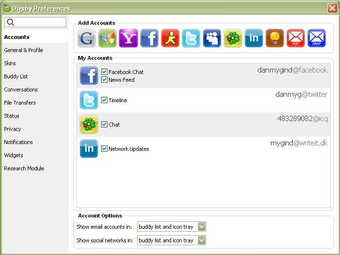 Her samles Instant Messaging som ICQ, MSN, Jabber, AIM og sociale netværk som Facebook, Twitter og LinkedIn. Endelig er der også mulighed for at håndtere mails fra Hotmail, Gmail, Yahoo Mail, AOL/AIM Mail samt IMAP- og POP-konti.