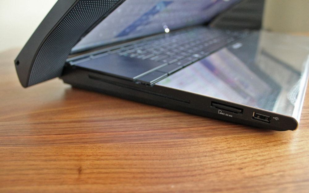 Stereohøjttalerne er placeret på siden af skærmen, og det gør at maskinen faktisk måler over en halv meter i længde.