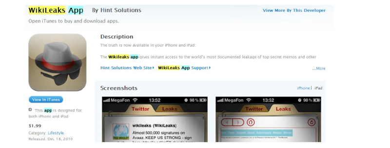 "Wikileaks-applikationen giver omgående adgang til verdens største lækage af tophemmelige memoer og andre fortrolige regeringsdokumenter," stod der blandt andet i applikationens beskrivelse.