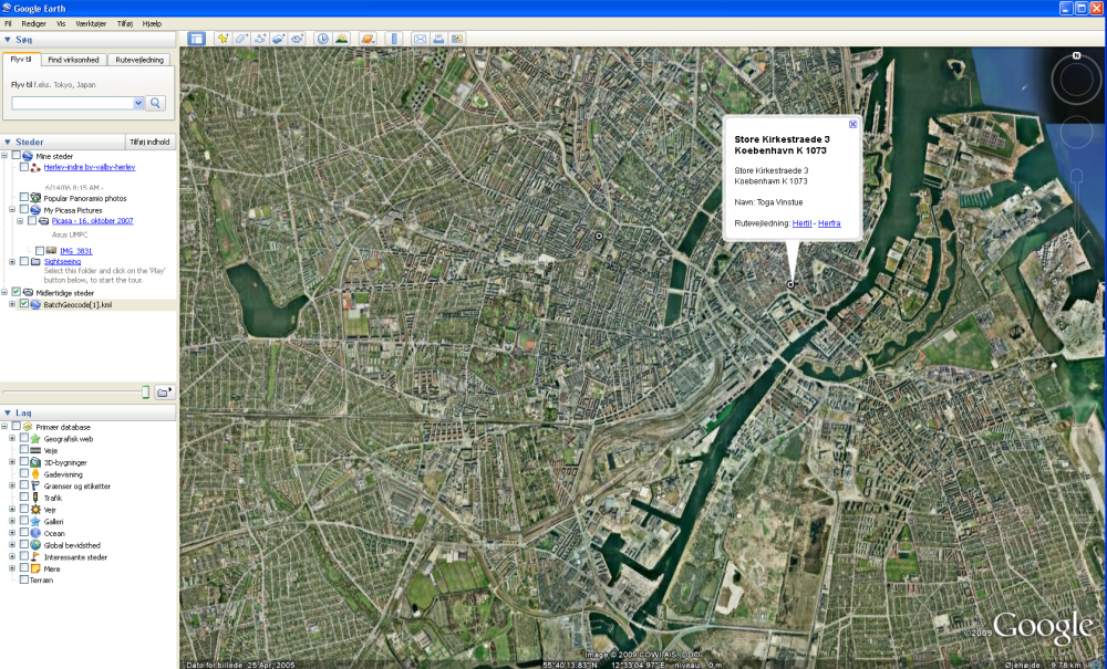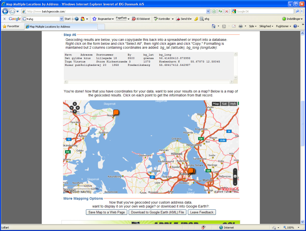Derefter klikker du dig videre og lader tjenesten oversætte adresserne til gps-koordinater, som så sættes ind i et Yahoo Maps-kort. Smart, nemt og ligetil.