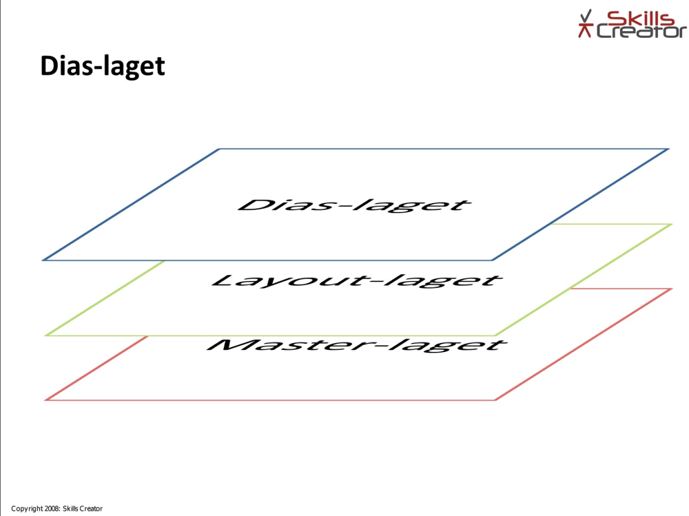 Du kan med fordel anskue et dias som bestående af tre lag: Masterlaget, Layoutlaget og Diaslaget.