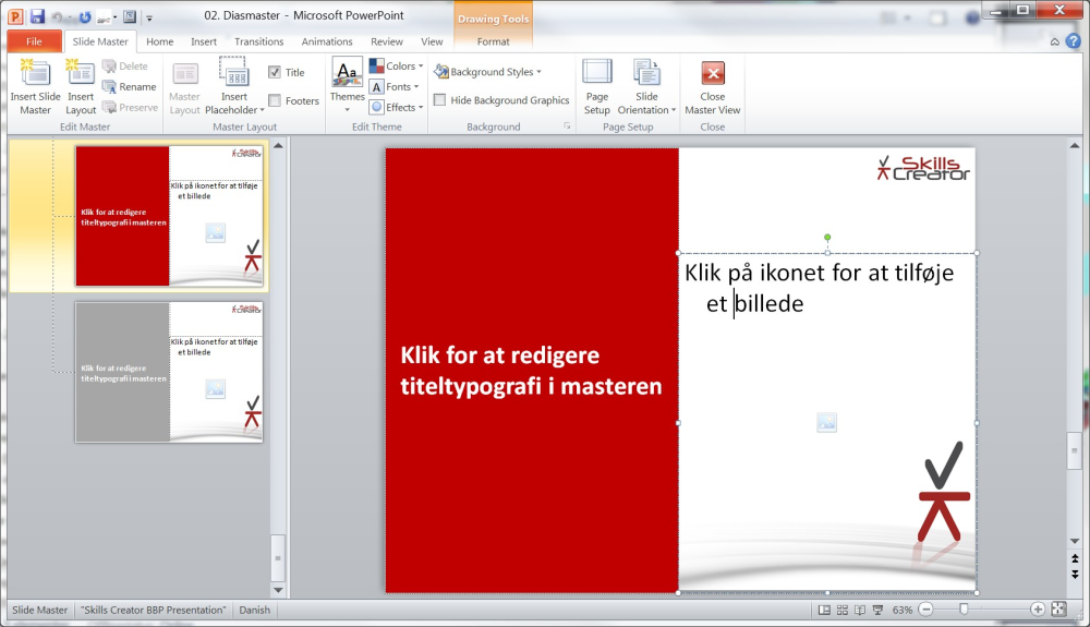 Det er med andre ord på Diasmasteren, du tilføjer logoer og andre gennemgående elementer.