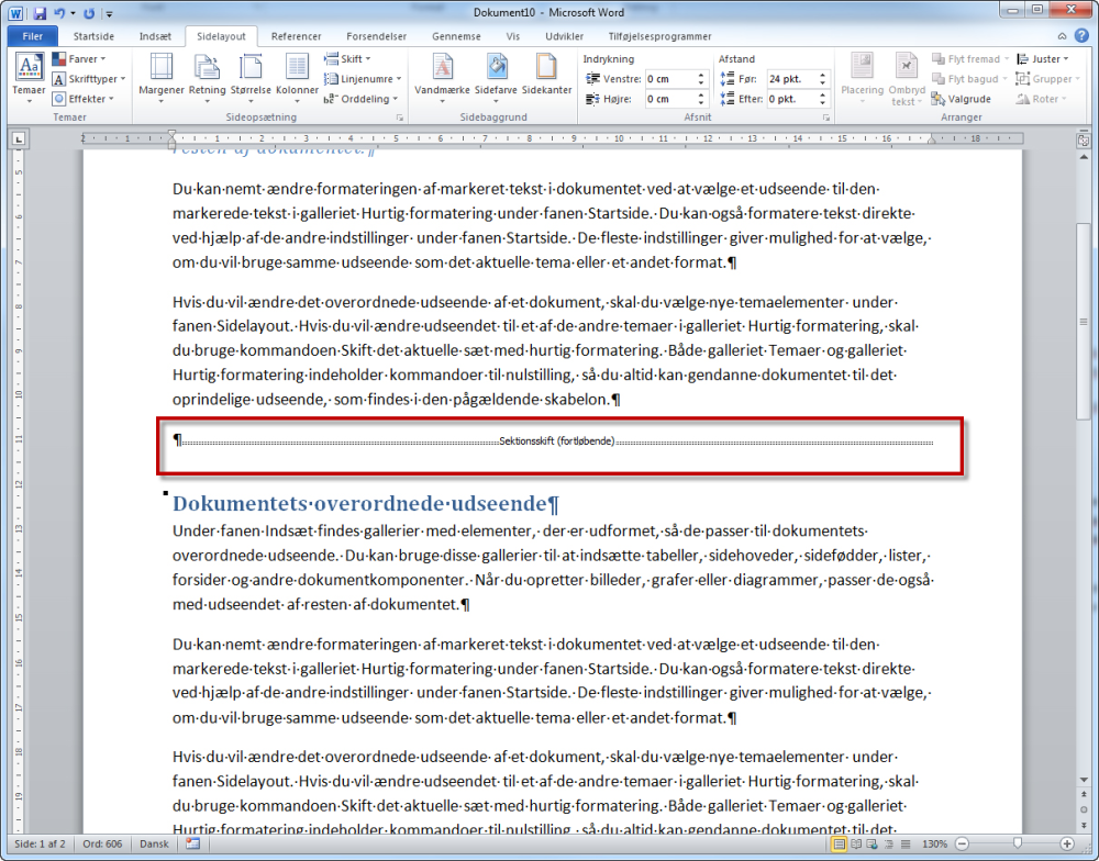 Du skal med andre ord indsætte et sektionsskift i dit dokument, hver gang du har brug for at ændre på dokumentets margener, papirretning, størrelse eller antallet af tekstkolonner (spalter) i dokumentet.