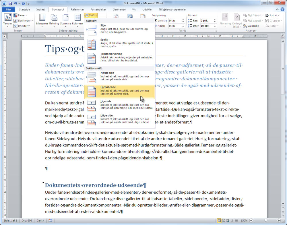 Som oftest er det smart at knytte et sektionsskift til et sideskift, så den nye sektion starter på en ny side. Men hvis du f.eks. vil anvende to spalter på en del af en side i dit dokument, kan du også gøre dette ved at indsætte to fortløbende sektionsskift og vælge det antal spalter, der skal være i den sektion, der skal være sat op i spalter.