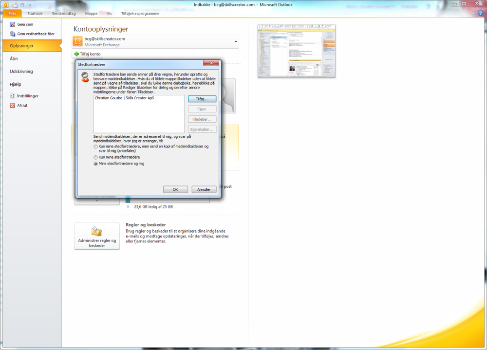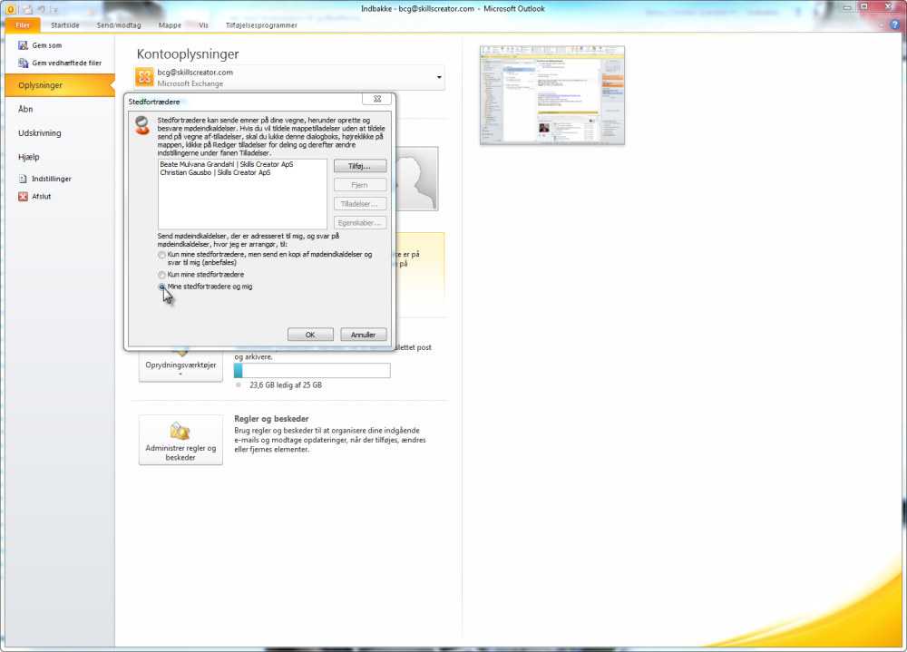 Men du kan også anvende stedfortræderfunktionen til at styre de fælles indbakker, I måtte have i firmaet. Hvis f.eks. jeres info@- eller salg@-mailadresser er oprettet som separate mailkonti på Exchange-serveren, kan I logge på den pågældende konto og udnævne de kollegaer (inklusive dig selv), der skal fungere som stedfortrædere for den pågældende konto.