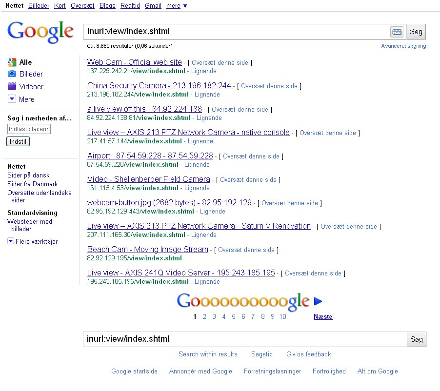 Ovenstående søgning returnerer næsten 2.000 resultater, der med få undtagelser alle giver adgang til live optagelser fra overvågningskameraer.