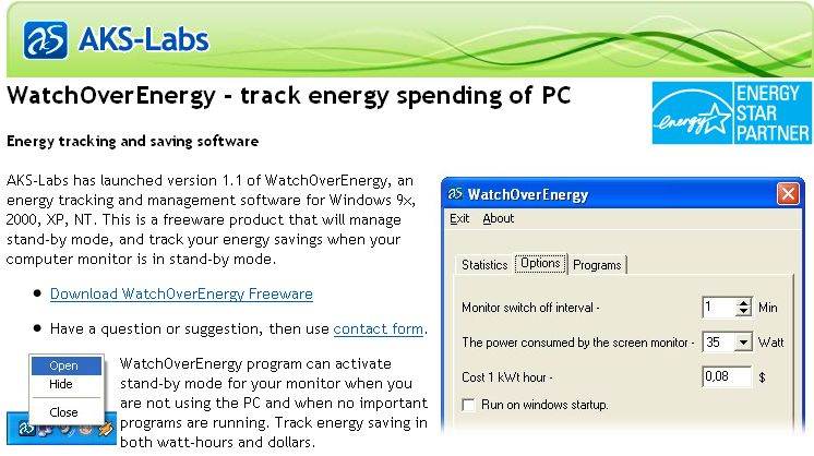 Selvom det efterhånden er stykke bedaget software, så er det også værd at lægge mærke til det her Energy Star-certificerede stykke freeware til Windows. Navnet er WatchOverEnergy, og hvis de amerikanske strømpriser ligner de danske, så kan applikationen spare dig for omkring 375 kroner om året. Mon ikke priserne 'over there' med al deres air conditioning er lavere end i Danmark, så besparelsen herhjemme bliver endnu bedre?
