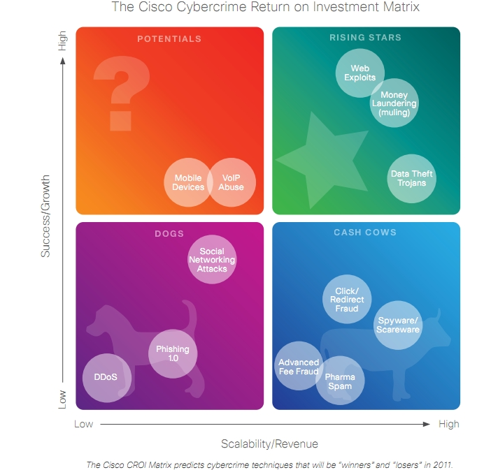 Nedenstående figur viser, hvordan Cisco vurderer indtjeningspotentialet og udbredelsen af forskellig cyberkriminalitet.