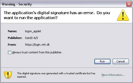 Da freelancejournalist Tania Andersen i går prøvede at logge på Virk.dk's login-løsning, fik hun en meddelse om, at certifikatet til digital signatur var forældet.
