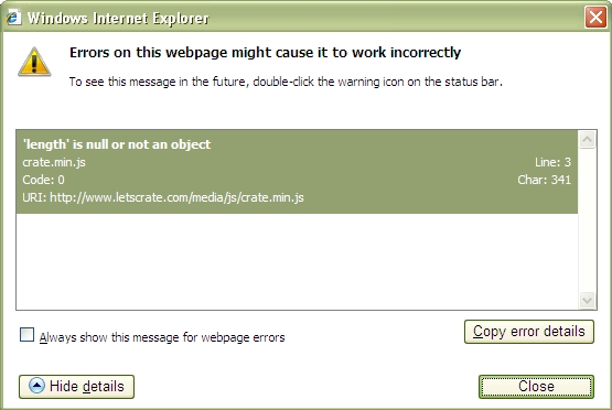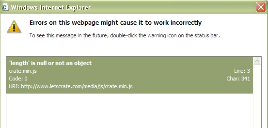Ifølge Internet Explorer 8's fejlmeddelelse er der en fejl i letscrate.coms javascript. Tilsyneladende er Chrome mere fejltolerant og lader sig ikke bremse af den slags.
