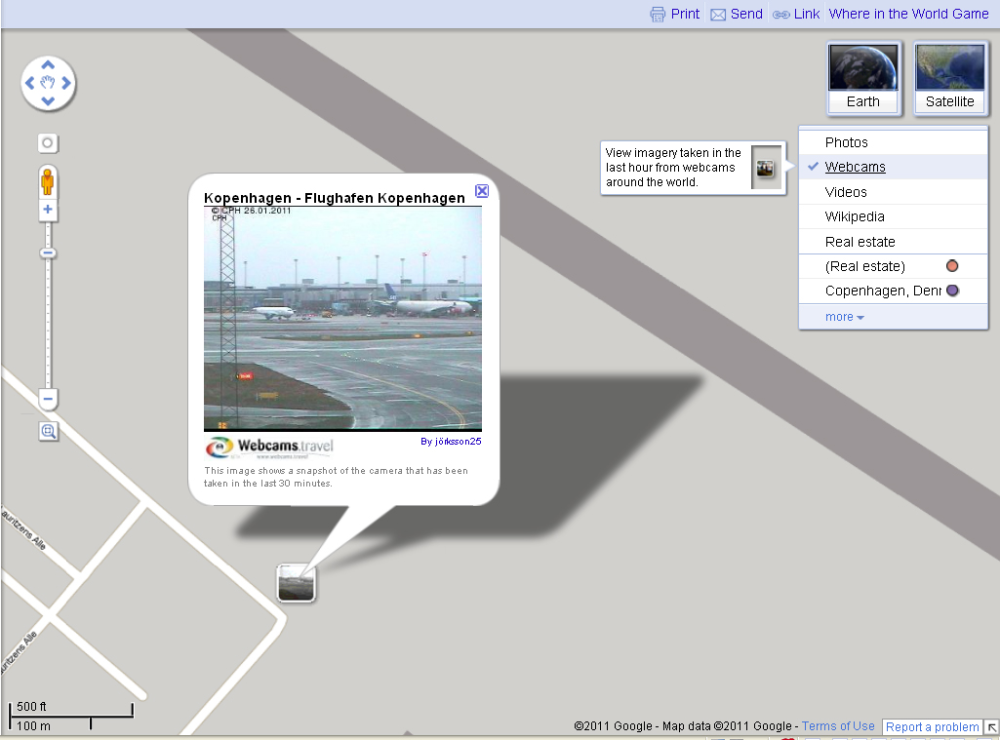 Det er også interessant at vælge laget webcams, der giver adgang til levende billeder - eller næsten levende billeder rundt om i verden. For da vi prøvekørte Google Maps, stødte vi ikke på nogen webkameraer, der viste levende billeder, men derimod stillfotos der er blevet taget med et bestemt tidsinterval, eksempelvis 30 minutter som her i Københavns Lufthavn.