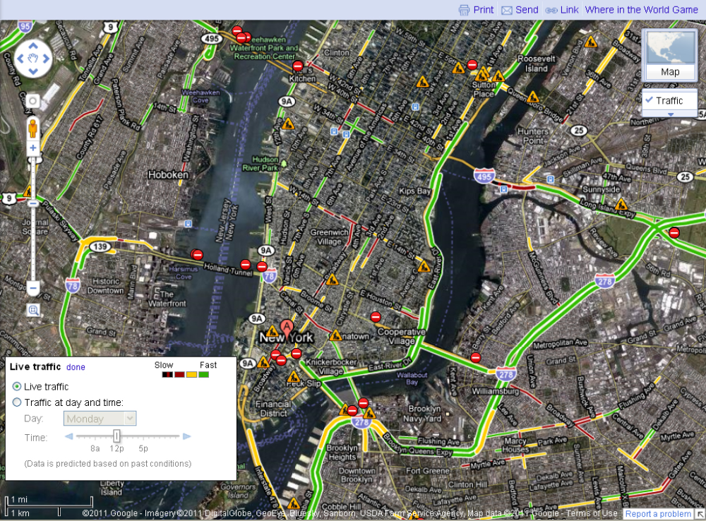 I USA kan de glæde sig over, at den seneste opdatering af Google Maps også har et lag, der viser den aktuelle trafiksituation. Her ser vi et billede af Manhattan i New York, hvor trafikken ser nogenlunde fornuftig ud. Billedet er også taget på et tidspunkt, hvor det er nat i storbyen, og det forklarer de mange strækninger markeret med grønt.