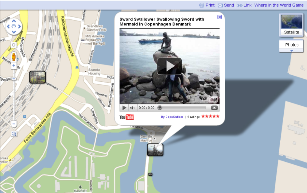 Hvis du vælger fotos eller video, kan du lade cursoren glide hen over små ikoner på det kort, som du har åbnet. Ved at klikke på dem kan du se fotos og video, der er geotagget til et bestemt sted, eksempelvis Tivoli i København eller Den lille havfrue.