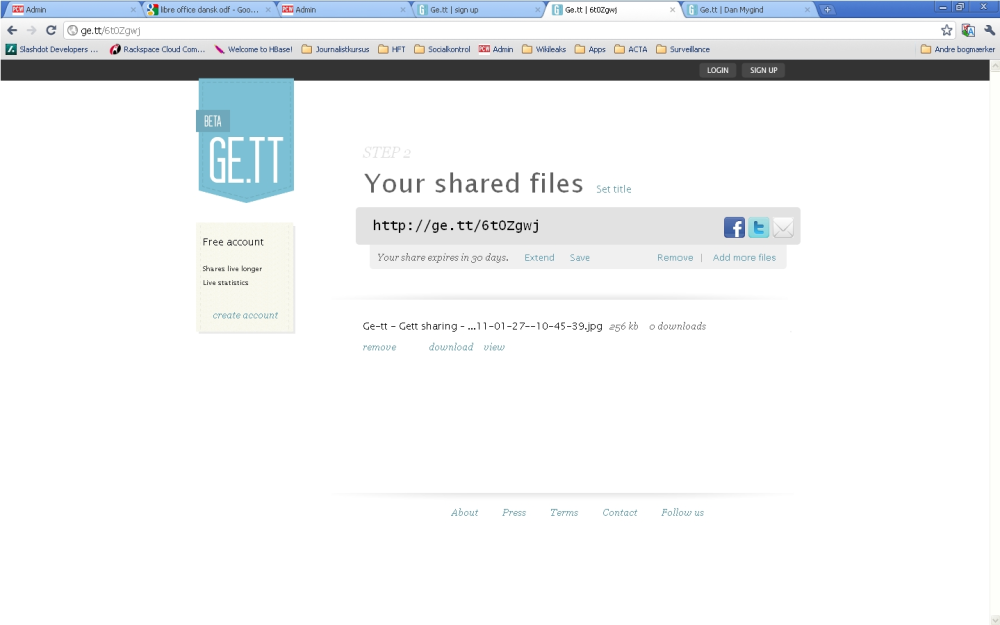 Her er en fil uploadet til ge.tt, uden at der er oprettet en konto. Den uploadede fil er tilgængelig i 30 dage. Den automatisk genererede URL kan nemt deles på Twitter, Facebook eller med mail ved at klikke på en af ikonerne til højre.