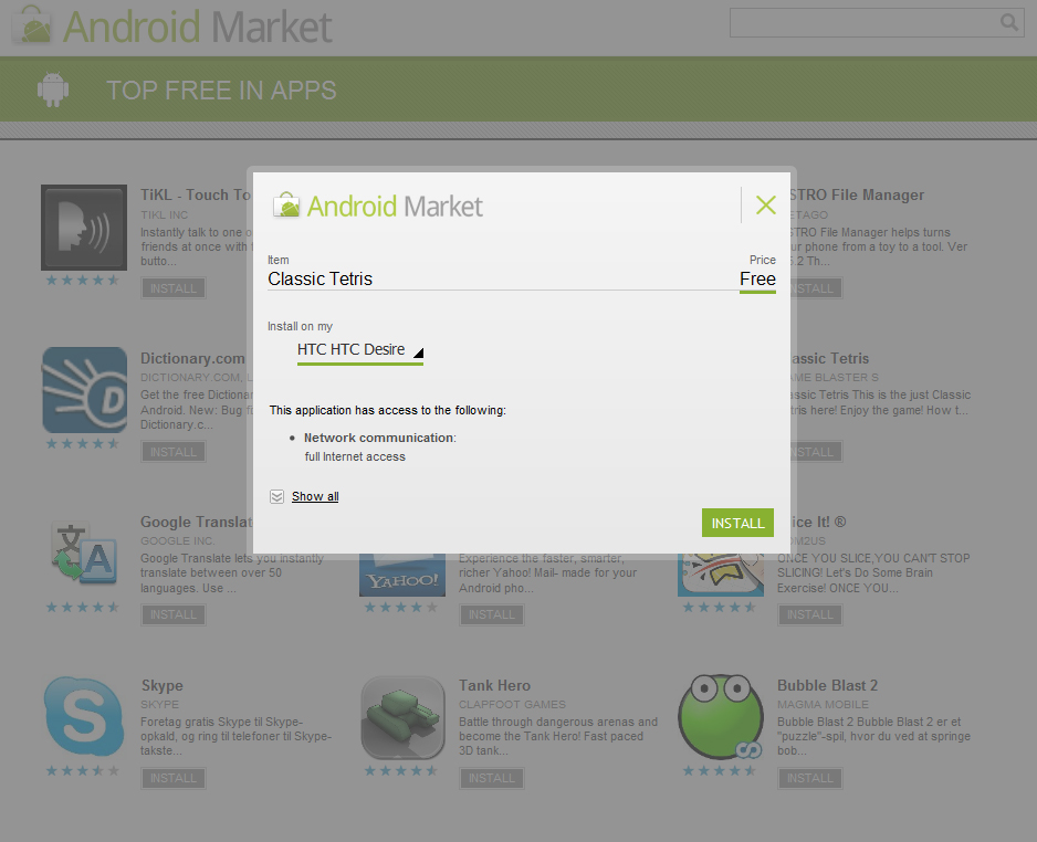 Hvis du ikke allerede er logget ind med dit Google-ID på Android Markedet i browseren, skal du gøre det nu. Dermed kan du vælge at installere app'en på eksempelvis din HTC Desire. Klik ja, og så bliver app'en automatisk downloadet.