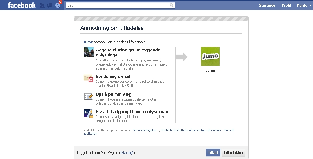 Derfor kan du logge på Jume.in med din Facebook-konto eller din Google-konto. (Denne skribent har stadig svært ved at vænne sig til, at Jume.in på den måde får adgang til så mange af mine Facebook-oplysninger som vist på billedet til højre, men socialt netværk og kontaktinfo er nu engang møntfoden, man betaler med i sociale netværk. Ellers må man holde sig væk.)