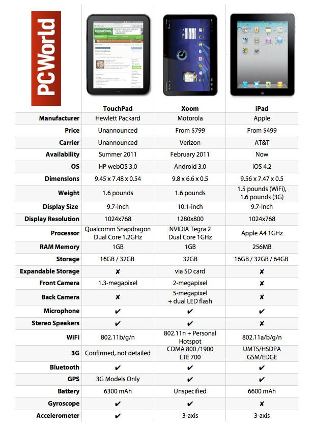 Ser man på de tørre specifikationer, lever den 725 gram tunge HP TouchPad fint op til konkurrenterne uden at give dem baghjul.