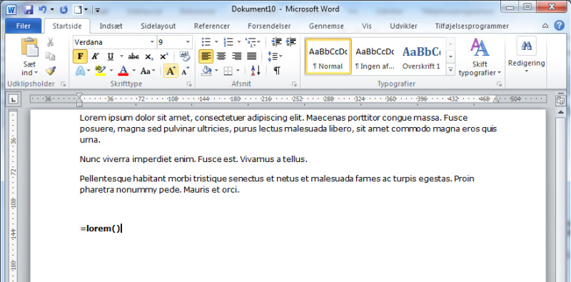 4. F.eks. vil =lorem(1) give ét afsnit tekst, mens =lorem(2,1) vil give to afsnit tekst med kun én linje i hvert afsnit.