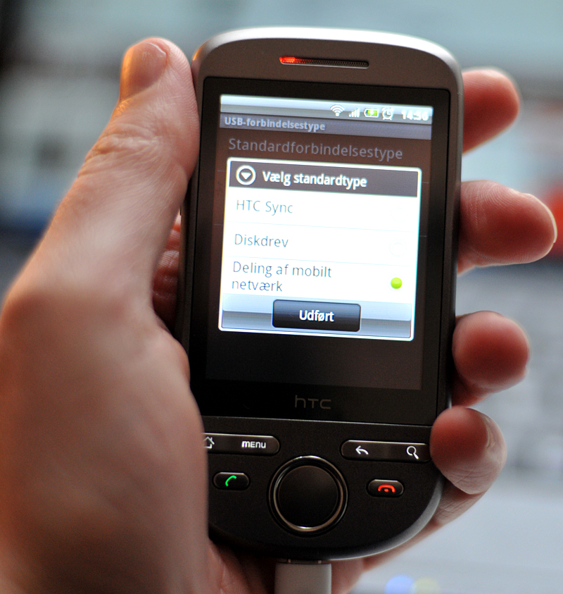 Først skal du installere et stykke software fra HTC på den bærbare, som kan downloades her. Derefter forbinder du blot telefonen med computeren via et normalt USB-kabel. På telefonens display får du nu tre valgmuligheder, og du skal klikke på "Deling af mobilt netværk". Så er det klaret, og du kan surfe løs på din bærbare computer.