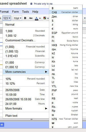 Uanset hvilken landestandard, du vælger, kan du indstille specifikke celler eller celletabeller til at blive formateret i en anden valuta. For at gøre det markerer du bare de relevante celler og klikker på knappen Flere formater på værktøjslinjen (det er knappen med mærket "123"). Her ruller du ned til undermenuen Flere valutaer og vælger den relevante valuta.