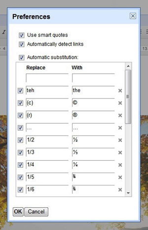 Hvis der er visse ord, du jævnligt staver forkert, kan du få Google Docs til automatisk at rette dem, mens du taster i tekstbehandlingsprogrammet. I menuen Funktioner vælger du Indstillinger. I dialogboksen indtaster du blot almindelige fejltastninger i det øverste felt under Erstat. I feltet til højre under Med indtaster du den korrekte stavemåde. For eksempel kan man ofte fejlagtigt komme til at taste ordet "jeg" som "jge." Derfor kan det være en god idé her at indtaste "jge" i Erstat-feltet og "jeg" i Med-feltet.