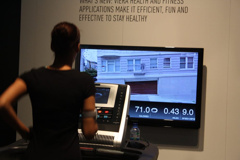 Hun demonstrerer en af funktionerne i Panasonics internet-tv, Viera Connect. Internettjenesten, som følger med de nye fladskærms-tv, giver blandt andet mulighed for at tilslutte et løbebånd. Samtidig med at du kan se, hvor mange kalorier du forbrænder, kan du altså følge en rute rundt i eksempelvis New York ved hjælp af Google Maps.