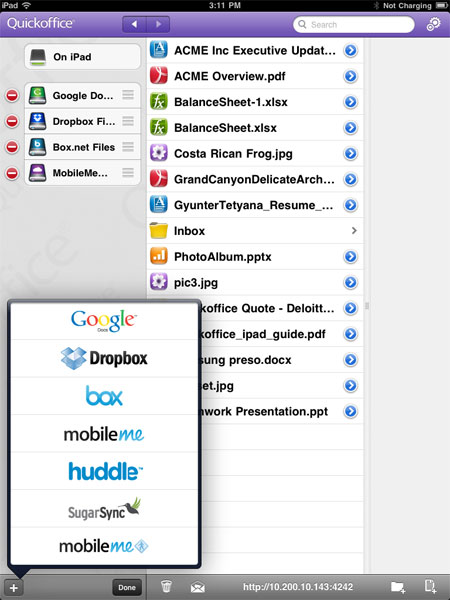 En af de fedeste funktioner ved Quickoffice til iPad er dens tætte integration med Dropbox og andre services til cloud-storage.