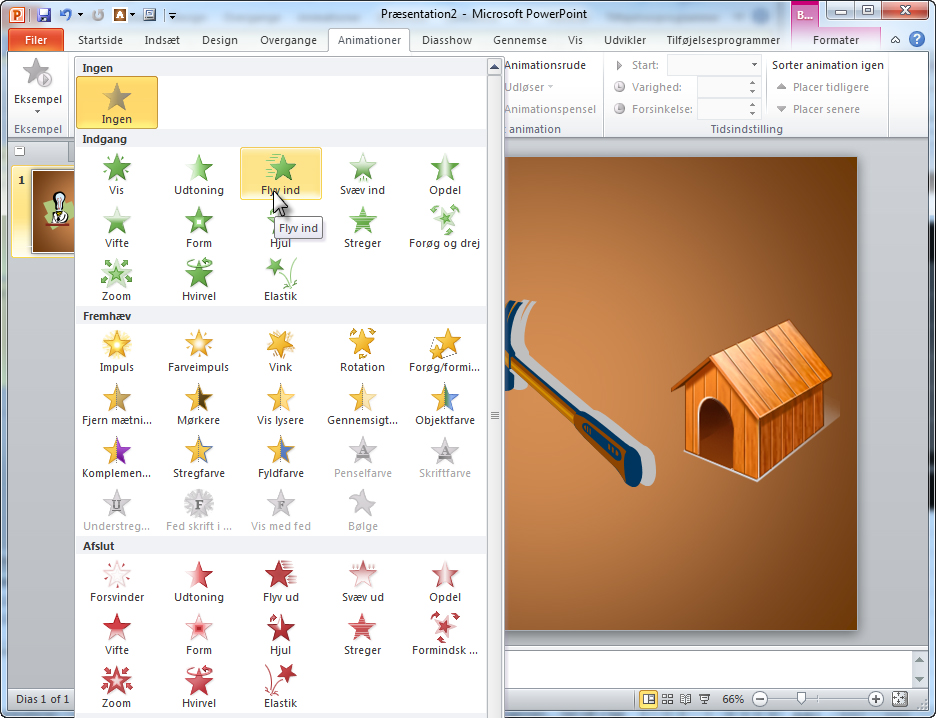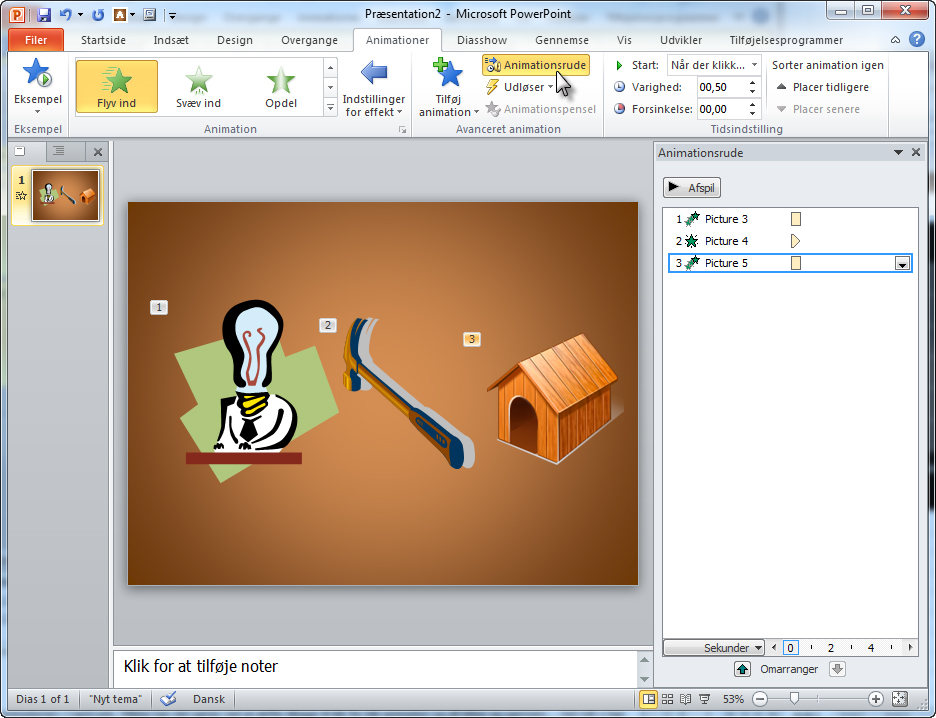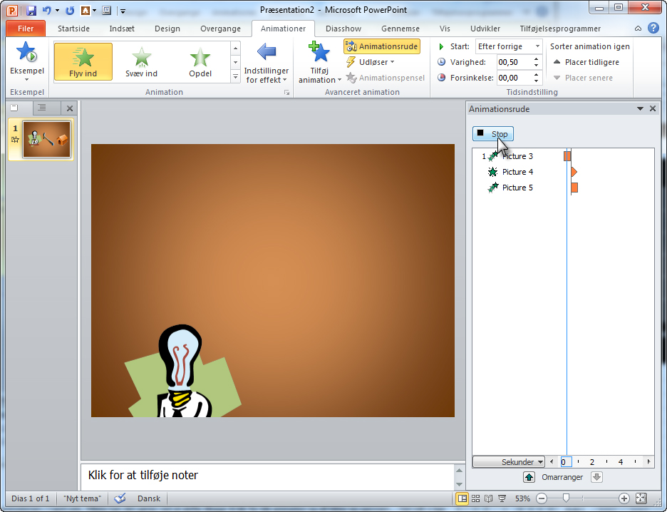 Du kan afprøve, hvordan animationen kommer til at tage sig ud i praksis, ved at klikke på Afspil-knappen øverst i Animationsrude-ruden. Så afspilles animationen. Du kan også klikke på Diasshow-knappen og gennemprøve animationen, som tilhørerne kommer til at se den.