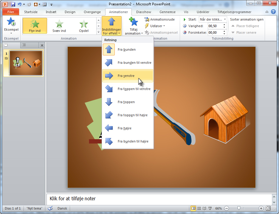Ved hjælp af Indstillinger for effekt-knappen kan du tilpasse indstillingerne for den valgte effekt. Vælger du f.eks. animationseffekten Flyv ind, kan du vælge, om det markerede objekt skal flyve ind fra venstre, fra høje eller fra oven eller fra neden på diaset.