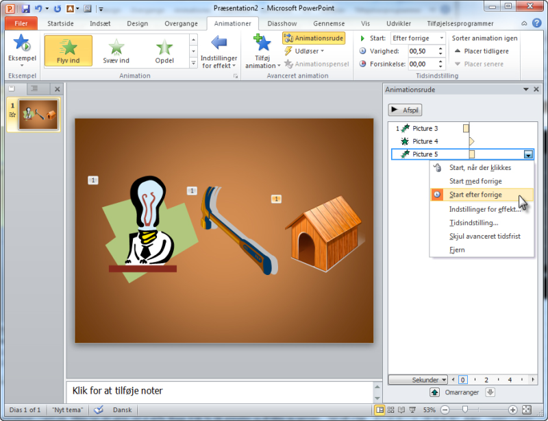 Vil du i stedet vise animationen i ét stræk, kan du markere hvert enkelt enkelt element, klikke på pil ned-knappen yderst til højre og vælge Start efter forrige. Nu vises hvert enkelt element efter hinanden. Bemærk hvordan du kan se det på tidslinjen i Animationsruden.
