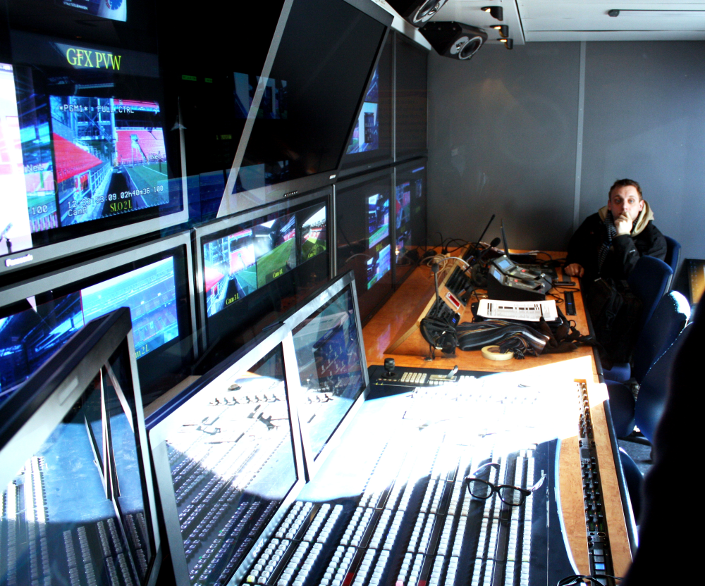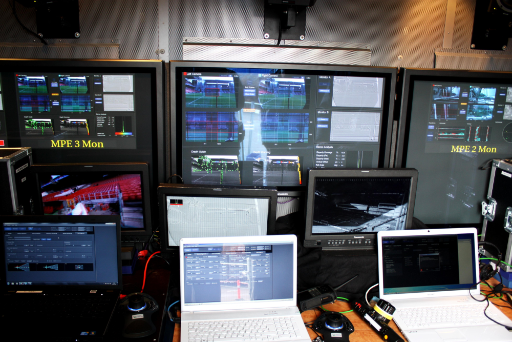 Ud over den primære producervogn sad der i en anden kontrolvogn fire folk med hænderne begravet i software og teknik. Deres job er at sørge for, at kameraerne i 3D-opsætningen er tilpasset og stemmer overens ned til mindste millimeter. Auto-funktionen er nemlig ikke præcis nok.