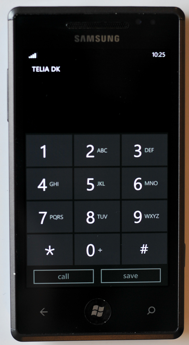 Windows Phone 7 Microsoft har valgt et meget stilrent udseende til opkald via Windows Phone 7, og der er store knapper. Da styresystemet ikke taler dansk endnu, må man affinde sig med tasten Call, når der skal ringes op. En dansk version af Windows Phone 7 skulle være klar til efteråret.