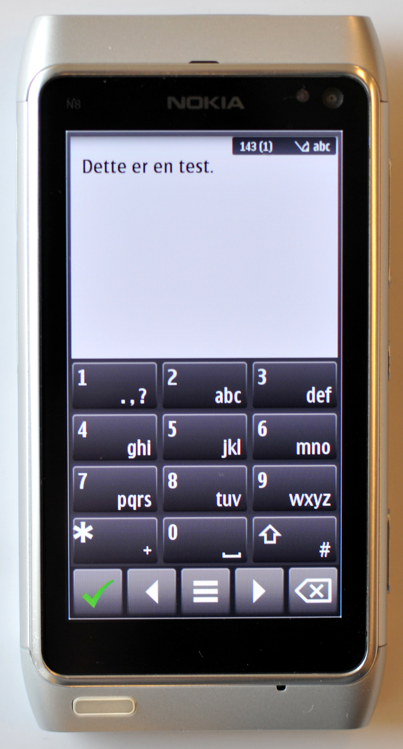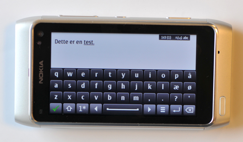 Symbian 3.0 Nokia har lært Symbian at tale dansk. Derfor er der adgang til tastatur med æ, ø og å. Som default vælger Nokia ikke at bruge et qwerty-layout til sin telefon N8, men derimod en gammeldags T9-opsætning. Qwerty-tastaturet kommer dog frem, hvis du vender mobilen horisontalt.