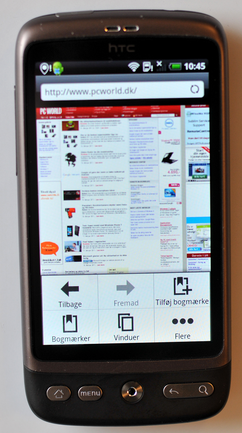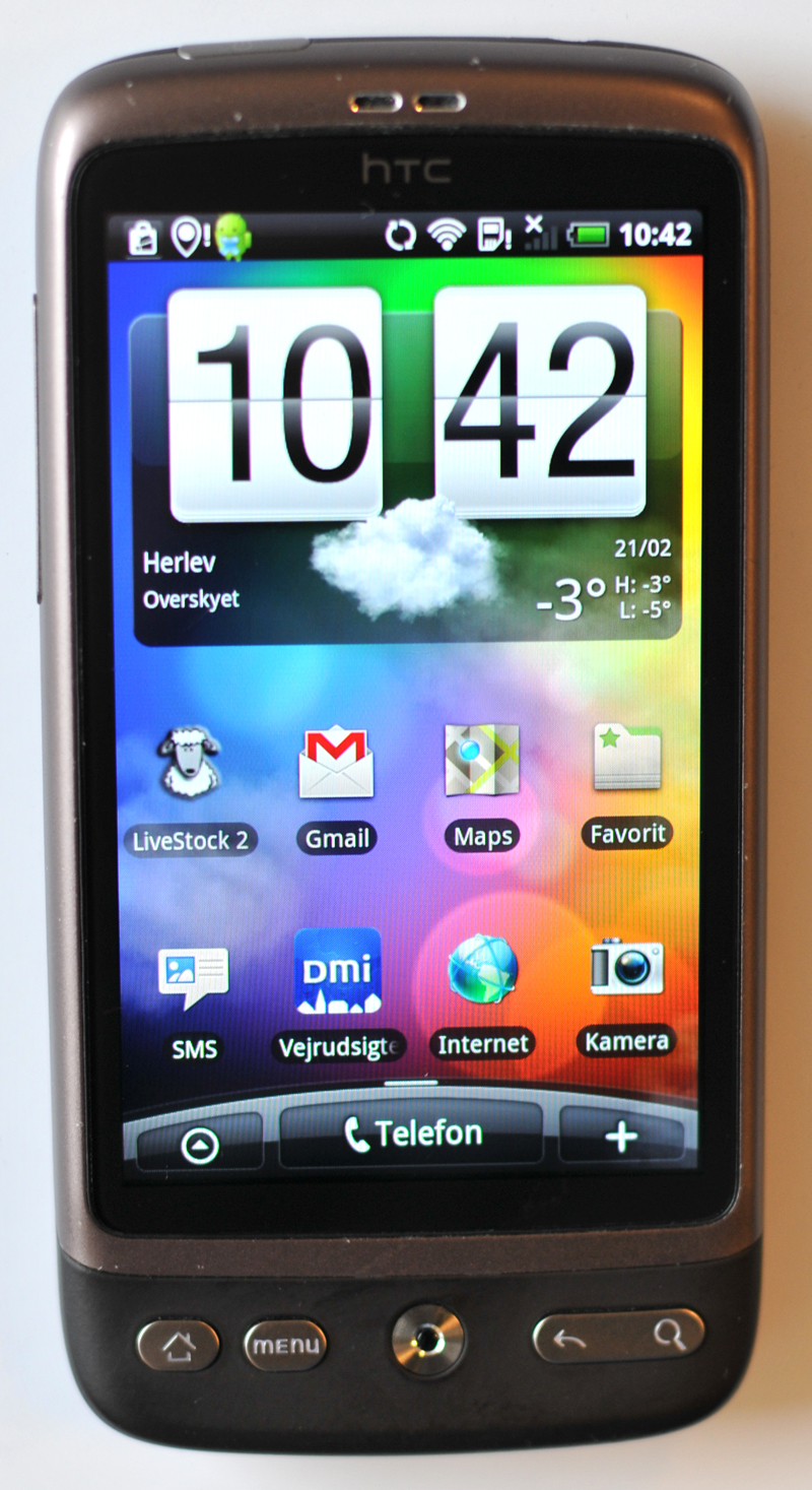 HTC Desire - Android Android er open source, og hjemmeskærmen bliver af de fleste mobilproducenter krydret en smule, inden nye telefoner ryger ud i butikkerne. Eksempelvis har taiwanske HTC smidt sin HTC Sense-skal ned over sine mobiler for at skille dem lidt ud fra andre Android-mobiler. Med Android er det muligt at skabe dynamiske forsider som her, hvor vejrudsigten opdateres løbende.