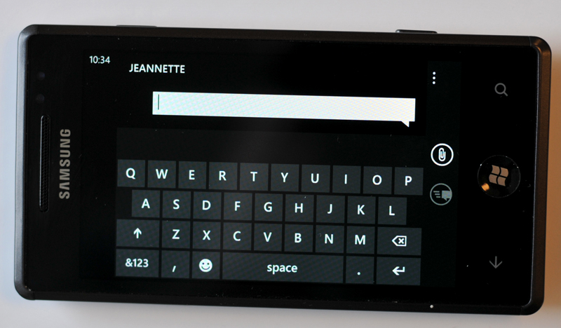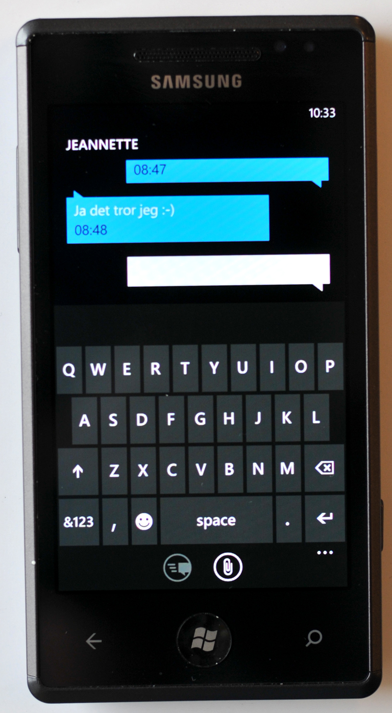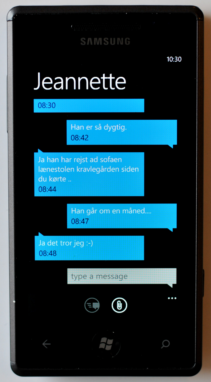 Windows Phone 7 Microsoft er også til samtaletråde, når der udveksles sms-beskeder. De er holdt i et blåt design, der gennemsyrer flere menuer i styresystemet.