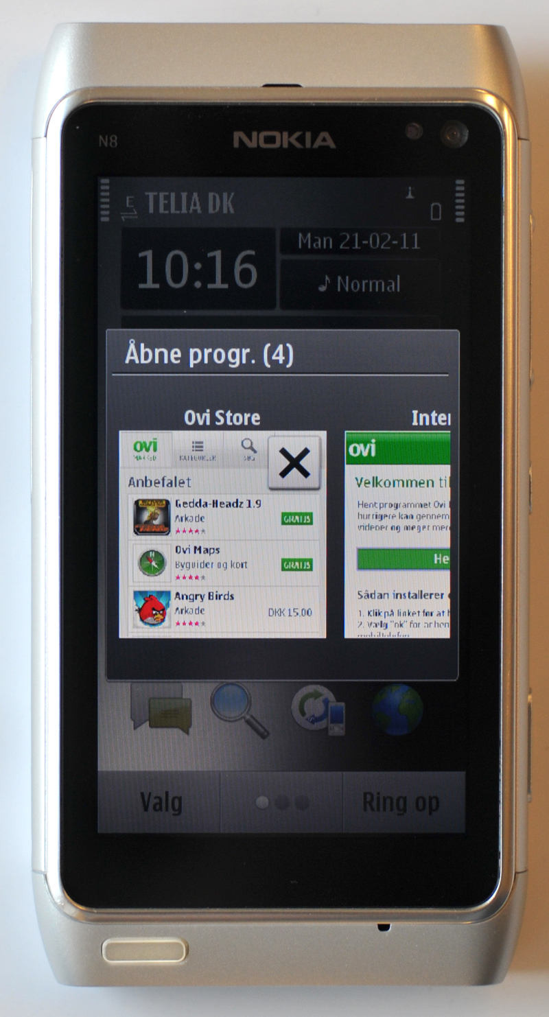 Symbian 3.0 Det er også muligt at multitaske på Nokias mobiler med Symbian 3.0, og du kan dermed have flere apps eller websider åbne samtidigt.