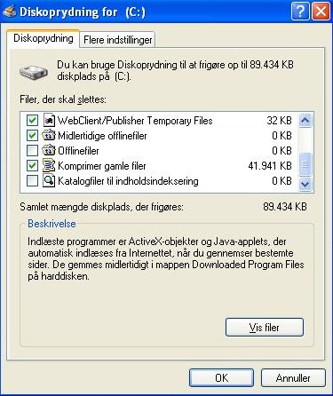 Den foreslår blandt andet at slette midlertidige internetfiler, filer i papirkurven, og som regel kan der også hentes en slat ved at komprimere gamle filer. Du klikker på OK, og henter sandsynligvis et antal megabyte.