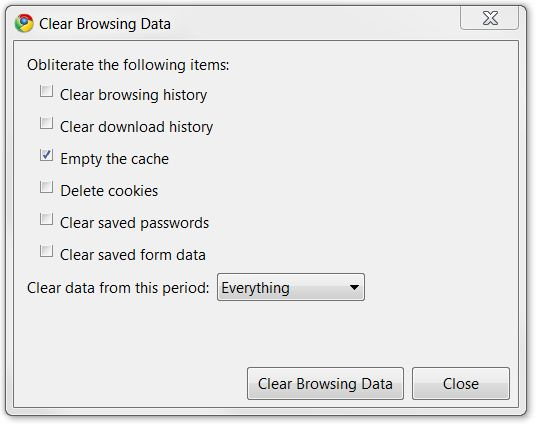 Google Chrome: Klik på værktøjs-ikonet i øverste højre hjørne og gå til 'Options', 'Personal Stuff' og 'Clear Browsing Data'. Her kan du vælge, hvad der skal slettes. Vælg 'Empty the Cache' og vælg derefter 'Everything' fra drop-down menuen.