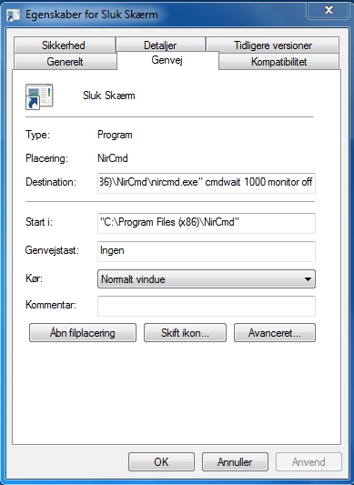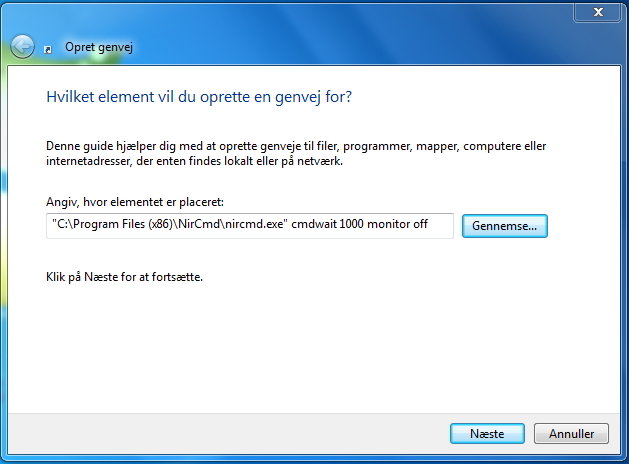 Resultatet ser i vores tilfælde ud som følger: "C:\Programmer (x86)\NirCmd\NirCmd.exe" cmdwait 1000 monitor off.