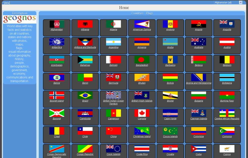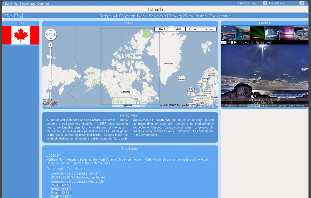 Herefter får du serveret solid information om landets historie, geografi, økonomi, styreform og meget andet. Webtjenesten trækker desuden fotos fra Googles Panoramio, og du kan dermed også se billeder fra det pågældende land.
