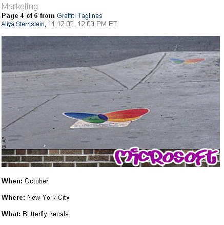 Erhvervsvandalisme. I 2002 sendte Microsoft Bill Gates til Central Park i New York City for at lancere internettjenesten MSN 8, men i den forbindelse overdængede virksomheden byens undergrundsbaner, telefonbokse og alt andet med en jævn overflade med billeder af MSN's logo af en sommerfugl og billedteksten "It's better with the Butterfly" - det er bedre med sommerfuglen. New York Times citerede i en artikel om denne marketingskampagne lederen af Municipal Art Society for at sige: "Dette er intet andet end forretningsgraffiti. Det er ikke bedre end alle de unge mennesker derude, der tagger togvognene."