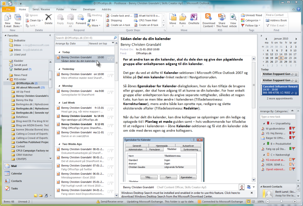Du kan nu læse nyheder fra den pågældende kilde i Outlook ved at klikke på dets undermappe i RSS-kilder-mappen. Så vises en liste med de seneste nyheder, og den seneste nyhed kan læses i sin fulde længde i læseruden. Nogle RSS-feeds kræver dog, at du åbner den tilhørende hjemmeside.
