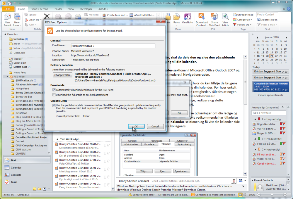 Du kan også indsætte linket til RSS-kilden manuelt. Højreklik på RSS-kilder-mappen og vælg Tilføj ny RSS-kilde. Kopier derefter adressen fra adresselinjen i Internet Explorer og over i Angiv placeringen af den RSS-kilde, du vil følge til Outlook-feltet i Ny RSS-kilde-vinduet. Klik på Tilføj-knappen og derefter på OK-knappen for at acceptere, at du vil tilføje RSS-kilden til Outlook.