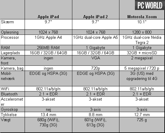 Men hvordan klarer iPad 2 sig på de tørre tal og rå specifikationer sammenlignet med sin forgænger og den store udfordrer Motorola Xoom? Resultatet kan du se herunder. Og se også vores test af Motorola Xoom her.