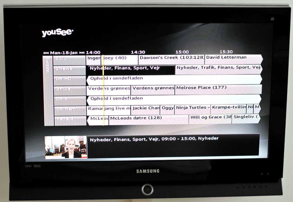 Med hjælp fra TV Guiden - en menu der hentes frem via fjernbetjeningen - får du et overblik over, hvad de forskellige kanaler viser lige nu, og hvad der kommer senere.